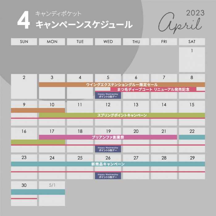 4月キャンペーンスケジュールのご案内 2023/04/04(火) 未分類 \キャンディポケット4月キャンペーンスケジュールのご案内/ キャンディポケットでは4月も盛りだくさんのキャンペーン企画を予定しております♪ キャンペーンの詳細は、随時トップページでお知らせしていきますのでお楽しみに(*゚▽゚)ノ ※開始・終了時間が設定されている場合がございますので、現在開催中のキャンペーンの詳細を必ずご確認ください。 ※予定は変更になる場合がございますが、その際は詳細ページにてお知らせいたします。