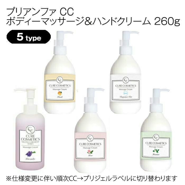 CCボディーマッサージ&ハンドクリーム全5種につきまして、順次商品名とラベルデザイン(CC→プリジェル)を変更し販売致します(※詳細画像2枚目のデザイン)。予めご了承下さいませ。